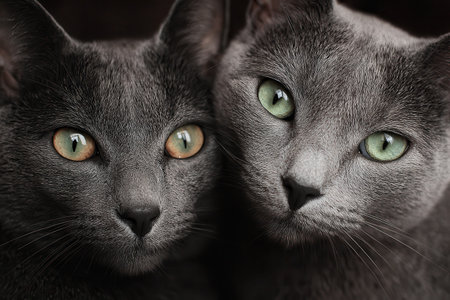 Two grey cats with striking green and amber eyes sit closely together, displaying their beautiful fur and gentle expressions