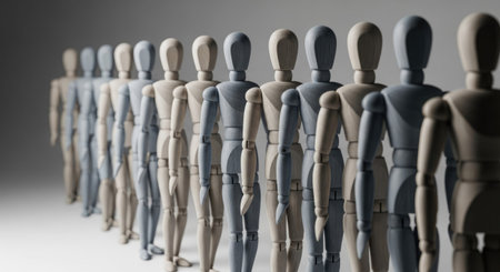 A row of blue figures stand in a line outdoors. The figures are faceless, with large, black eyes. They are positioned in front of a blurred, green background, and the sun is shining brightly on them.