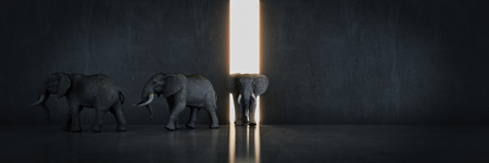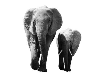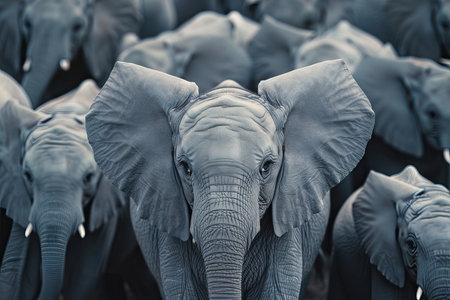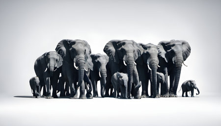 A captivating scene featuring a group of majestic elephants walking together. The elephants display their unique characteristics and social bonds against a serene white backdrop, making this image perfect for nature enthusiasts and wildlife conservation themes.