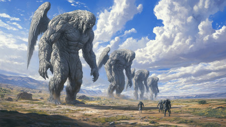 Massive winged giants loom over a vast, open landscape as three adventurers cautiously approach, dwarfed by the towering figures under a dynamic blue sky with fluffy clouds.