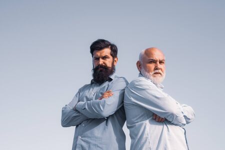 Elderly Senior man and bearded son - two generation concept. Man in different ages. Elderly pensioner and hipster son. Aged father. Family tradition.