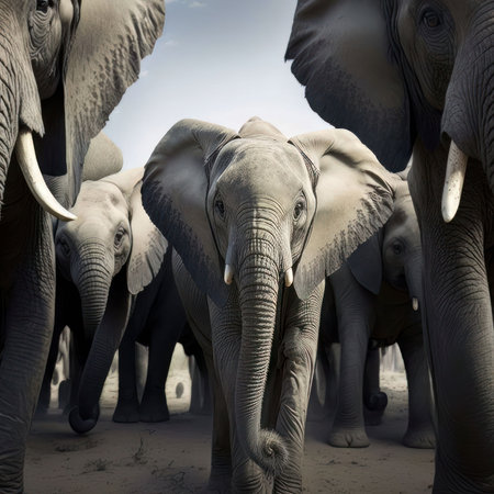 An AI generated illustration of a herd of African elephants standing in the open savanna
