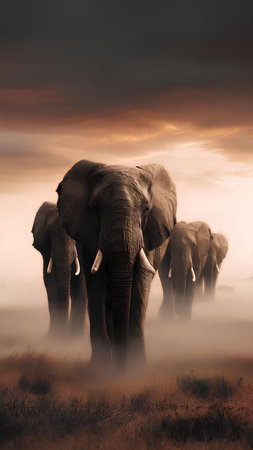 Three majestic elephants walk confidently through a dusty landscape showcasing their power and grace amidst a hazy atmosphere.