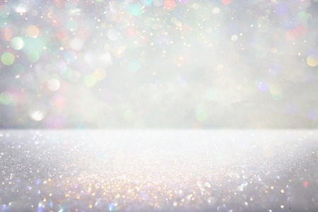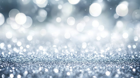 Sparkling silver glitter with soft bokeh lights creates dreamy and festive atmosphere with luminous white and gray tones