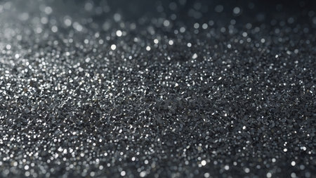 A detailed shot of silver glitter with selective focus, capturing the sharp, reflective particles against a softly blurred background, creating a sparkling, magical effect.