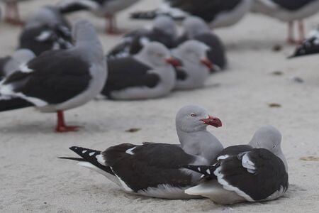 Group of Dolphin Gulls (Leucophaeus scoresbii) on a sandy beach in the Falkland Islands.