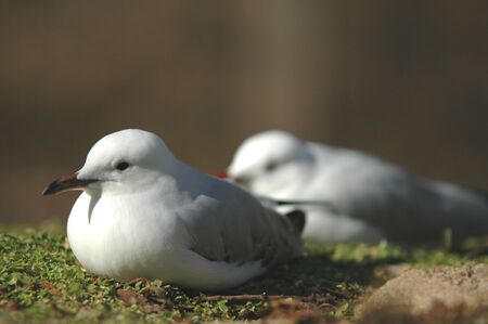 A pair of seagulls appear to be resting on a bed of moss.