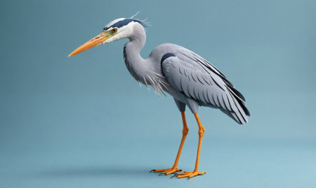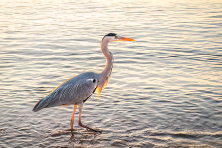 Gray heron standing majestically by the lake at sunset, displaying its elegant plumage and sharp beak