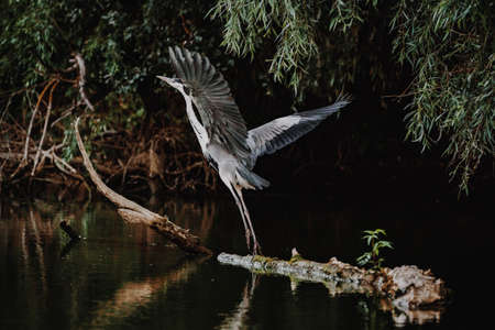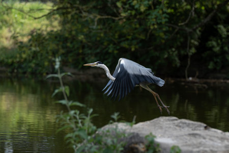 The flight of a gray heron in the lake of Park des Buttes-Chaumont
