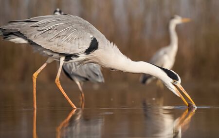 Grey heron (Ardea cinerea) hunting at Lake Csaj, Kiskunsagi National Park, Pusztaszer, Hungary. February. It feeds mostly on aquatic creatures.