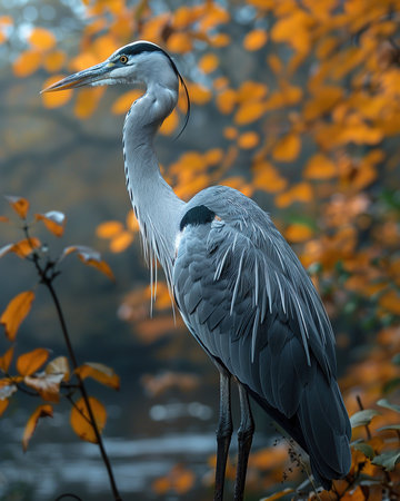 Elegant heron captured by the water against fiery autumn backdrop, showcasing wildlife beauty. A.I.