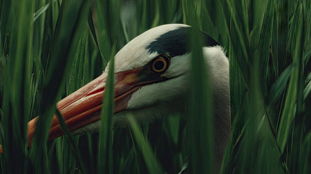 A regal great heron stands in shallow waters against a backdrop of lush reeds, the setting sun casting a warm glow over its elegant plumage.. AI Generation
