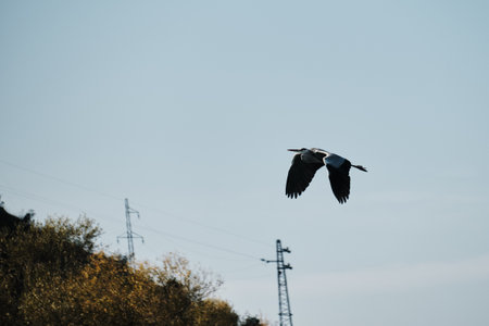 A graceful heron in flight, captured mid-air against a soft blue sky, symbolizing freedom and untouched nature