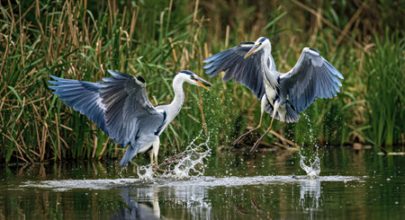 Serene heron and little bird at misty dawn wetland. That the image is generated using AI.