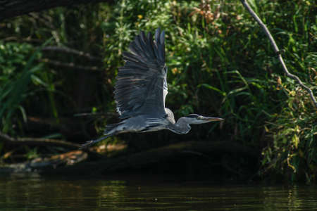 Grey heron ardea cinerea wild bird in flight flying over river water in rural setting