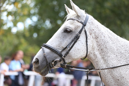 Portrait of stunning dressage white gelding horse in bridle. Close-up of the head of a calm horse. Equestrian competition show. Green outdoor trees background. Thoroughbred beautiful stallion