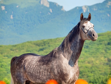 Portrait of graceful thoroughbred gray horse on sunny green leaves background. Multicolored horizontal summertime outdoors image