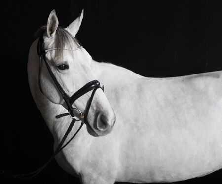 Portrait of a gray pony in the bridle. Equestrian sport. Dressage of horse in the arena.
