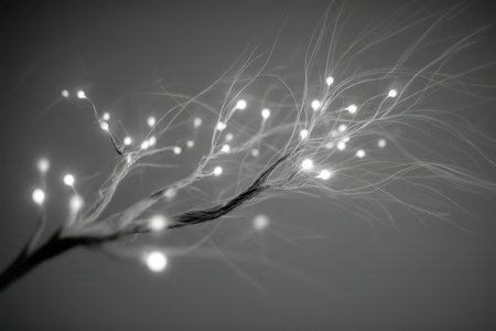 Glowing lights spread along thin, delicate branches resembling a tree against a softly blurred background. The lights create an ethereal and futuristic ambiance