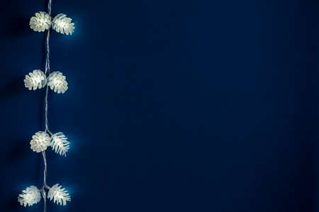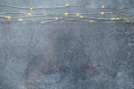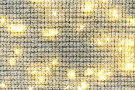 Christmas Warm Light on Natural Background Top View with Copyspace. Beautiful Garland Lights Texture or New Year Pattern for Xmas Design