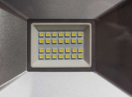 Electronic light-emitting diodes on white circuit board in household LED bulb. Close-up of yellow or clear semiconductor light sources of different color temperature. Electric lamp
