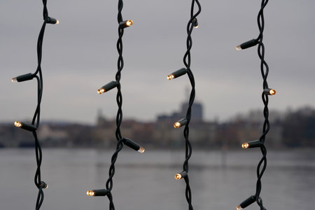 City skyline on the bank of Lake Constance in Germany with silhouette of Christmas lights in the foreground. Outdoor seasonal decoration.