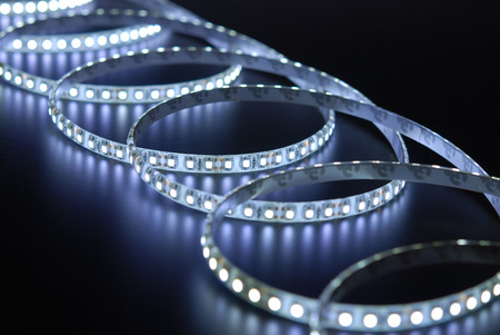 Coils of rgb led strip on a black table. Led strip for creative lighting collected in a black coil, tools for lighting and light effects.