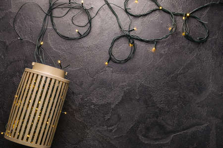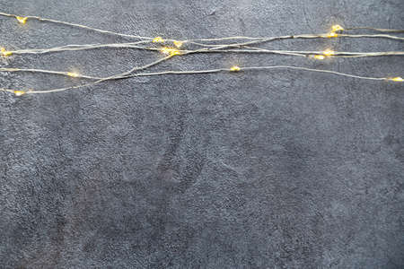 The garland is on. Glowing electric garland on a dark background. view top place for text