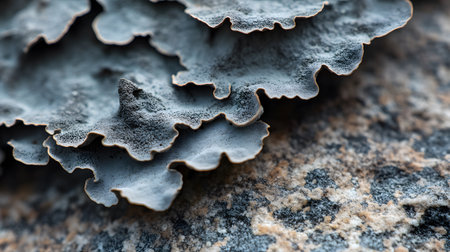 A detailed macro shot showcases a cluster of pale gray lichen clinging to a rough stone surface. The soft, outoffocus background suggests a natural, outdoor environment.