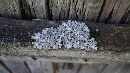 Close-up of lichen growing on weathered wood surface.