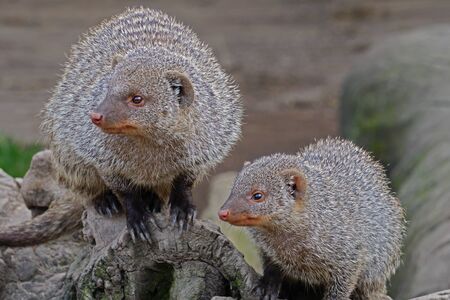 Two little animals with angry snouts. Ferocious mongoose (pharaoh mouse) in its natural habitat. Close-up.