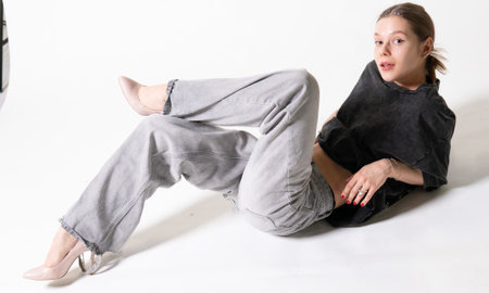 Portrait of young red-haired girl posing, lying on floor in top and oversized jeans isolated over grey studio background