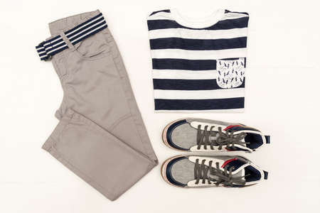 Top view fashion trendy look of kids clothes on white wooden background. Kids fashion.