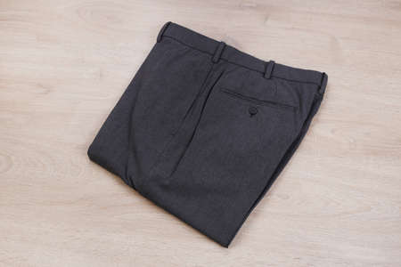 A pair of stylish gray pleated trousers are neatly arranged on a neutral-colored surface, captured in a well-lit studio setting.
