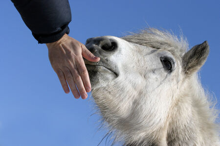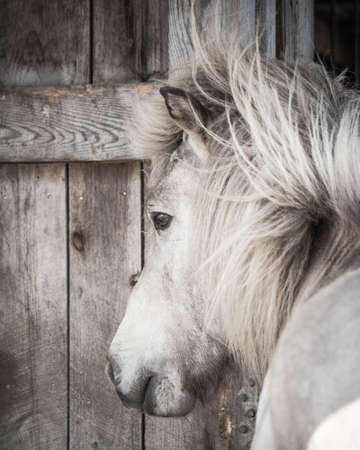 Close-up portrait of an Icelandic white horse in a on a farm in winter.
