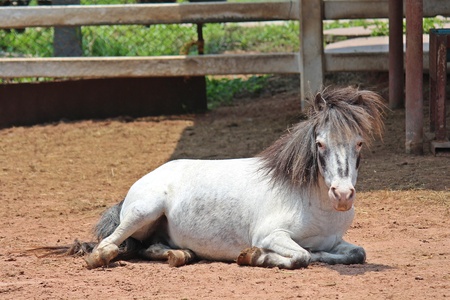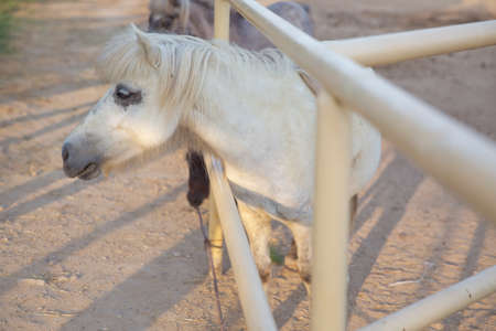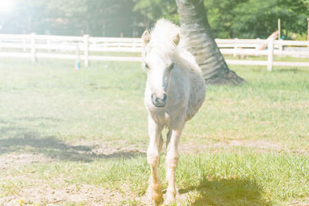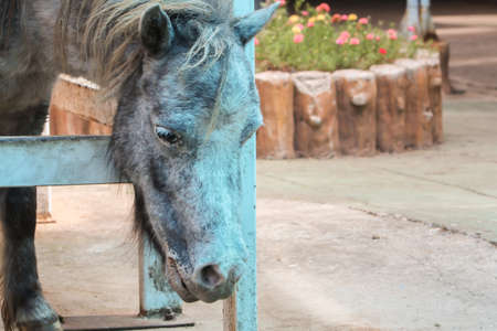 pony mini dwarf horse , close up stand at the grass . Dwarf horse standing relax in stable for thai people and foreigner travelers travel and visit at animal farm . One dwarf horse is watching
