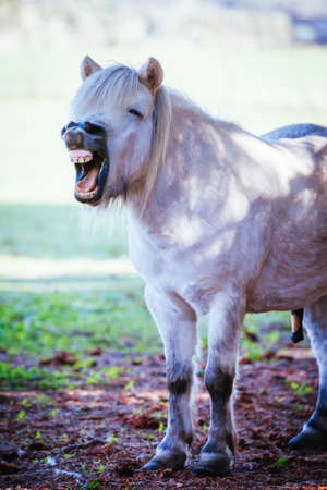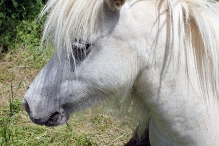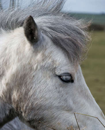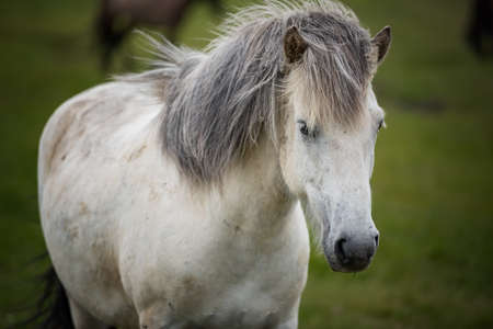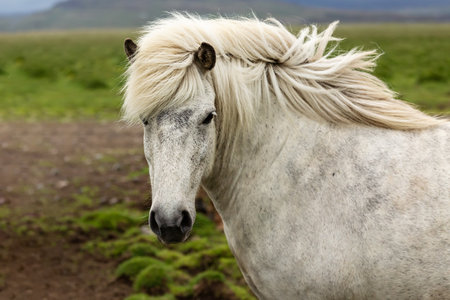 Portrait of a beautiful Icelandic white horse with a lush mane. Iceland.
