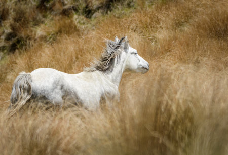 A white Kaimanawa horse running among the tussocks. New Zealand.