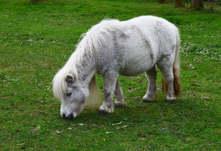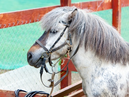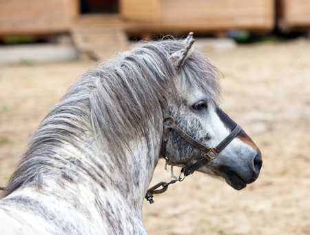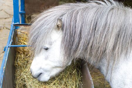 Cute little shetland pony horse with long hair inside of farm paddock, selective focus