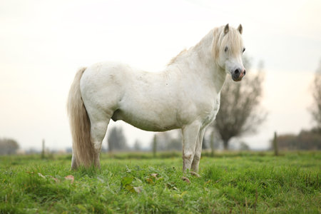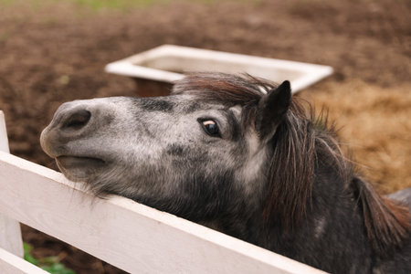 Cute pony at paddock outdoors. Lovely domesticated pet