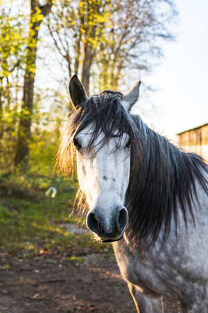 Portrait of a beautiful white horse with a halter on its muzzle and a white mane, which is illuminated by sunlight on a foggy morning. Equestrian life.