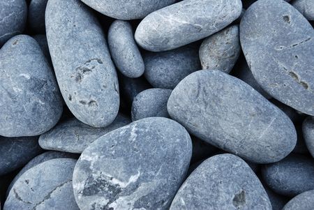Close-up view of many smooth, gray river rocks, creating a textured background. The image is detailed and shows the variations in the stone's shape and size.