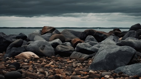 An AI generated illustration of a tranquil scene of a beach with a rocky shoreline and calm waters