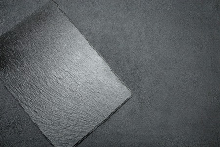 top view of empty black slate plate on cement background. Empty space for your design.