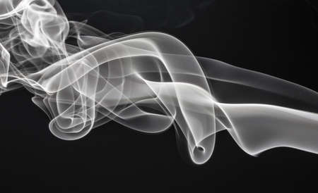 Puffs of white, gray smoke spread on a black background, curling in a fancy dance.
