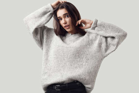 Fashionable portrait of a pretty young girl model in a stylish gray knitted sweater posing and looking at the camera on a beige background. beauty girl indoors