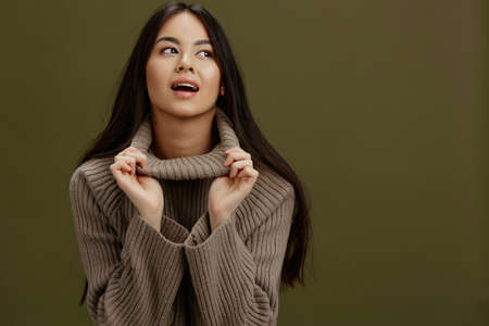 Displeased young afraid woman wearing a high neck sweater, hiding form problems.