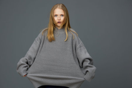A surprised young girl wearing an oversized grey sweater against a muted background, showcasing a sense of curiosity and playfulness in her expression