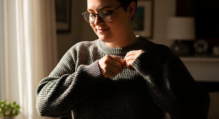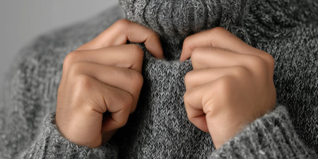 close-up of turtleneck collar being adjusted, hands pulling sleeves over fingers.