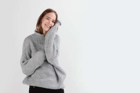 A young girl in a gray wool sweater. Photo on a light background. Concept of warm clothing. Copy space. Natural wool. Clothes for the cold season.